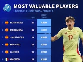 U21欧洲杯A组球员身价榜:西班牙三小将并列第一