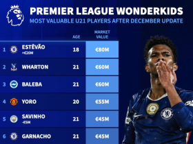 德转更新后英超U21球员身价TOP10:埃斯特旺8000万欧元第1