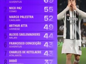 本赛季意甲成功过人榜:伊尔迪兹69次居首,帕斯55次排第二