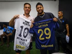桑托斯vs格雷米奥赛后,内马尔和阿图尔见面并交换球衣
