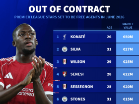 英超合同6月到期球员身价榜:科纳特5000万欧元第1,B席上榜