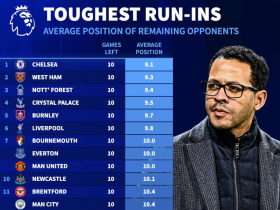 德转统计英超剩余10轮各队对手平均排名:切尔西赛程难度最高