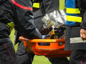 惊险一幕,前法国国脚西迪贝头部被撞后戴着护颈被担架抬下