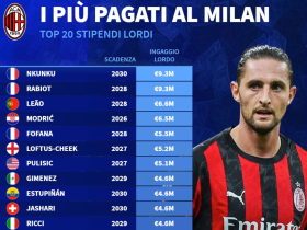 米兰本赛季税前年薪TOP20:恩昆库、拉比奥第1,普利希奇第7