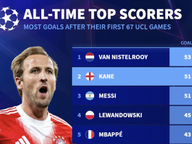 凯恩欧冠生涯前67场打入51球,仅次于范尼