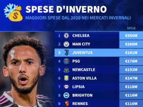 德转列过去5年冬窗引援支出排名:切尔西、曼城、尤文前三