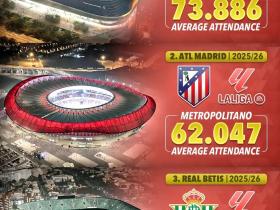 西甲联赛目前上座人数前三名的是皇马、马竞和皇家贝蒂斯