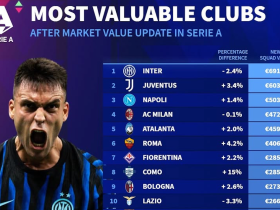 意甲俱乐部身价排名:国米超6.9亿第1,尤文第2,那不勒斯第3